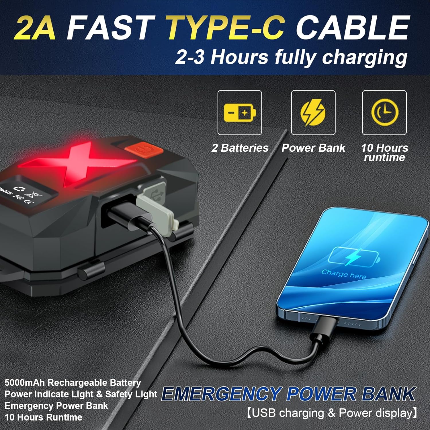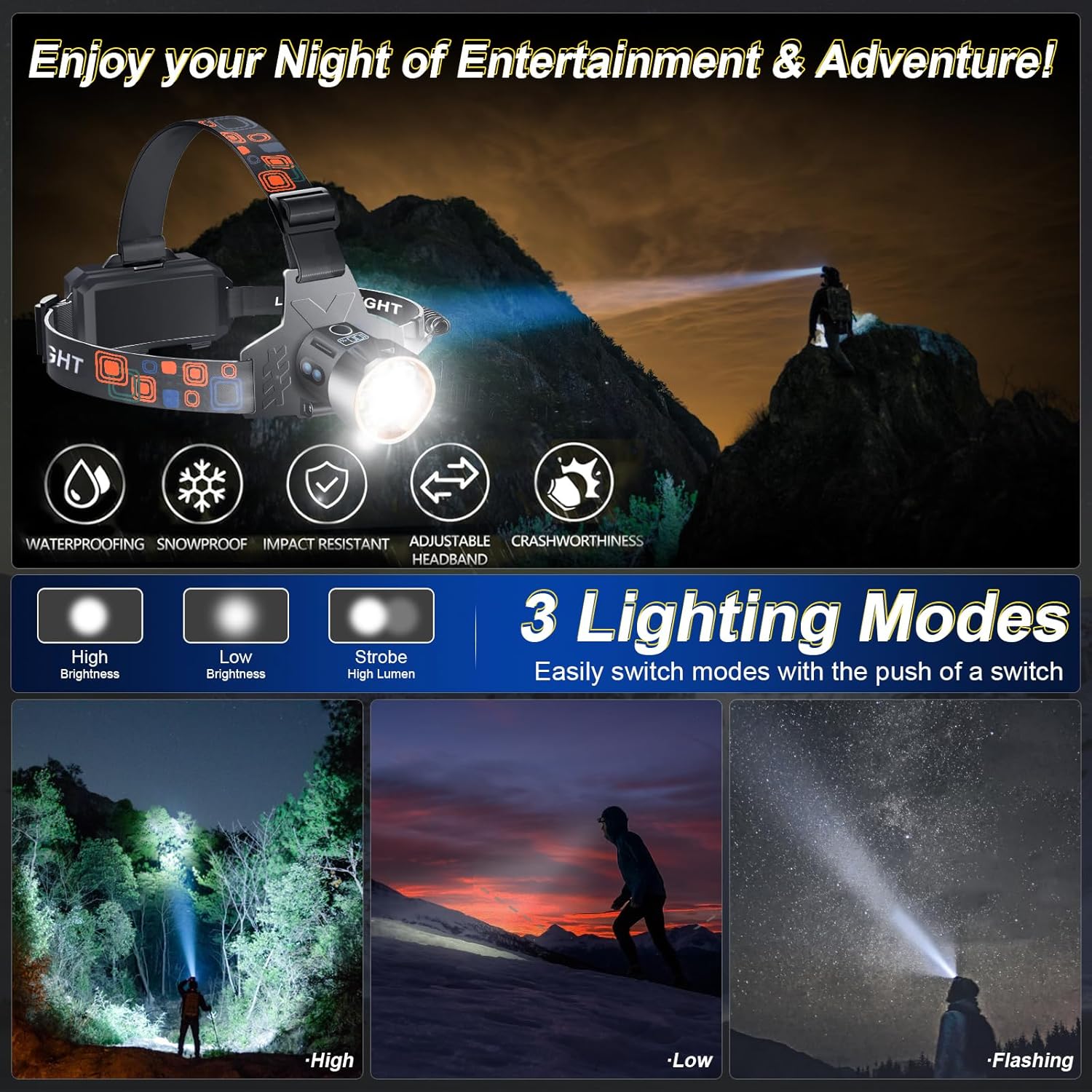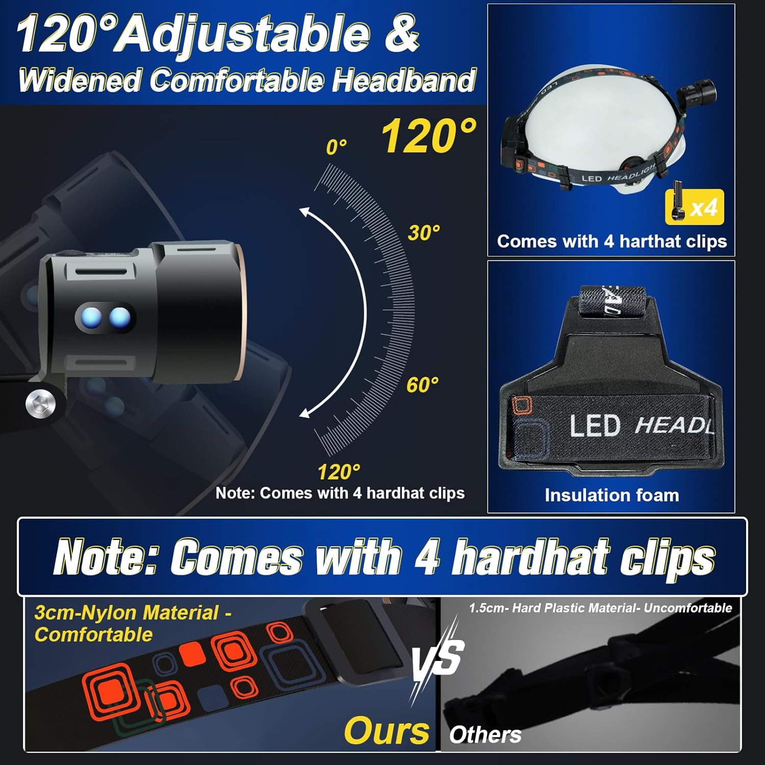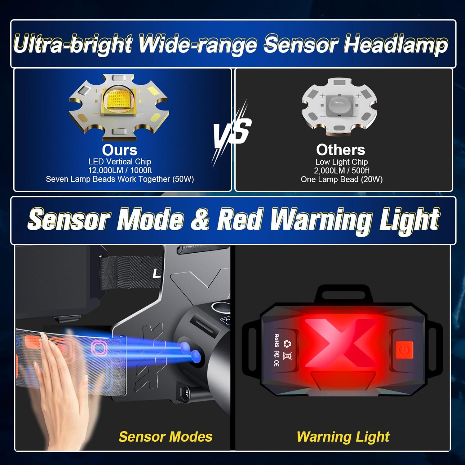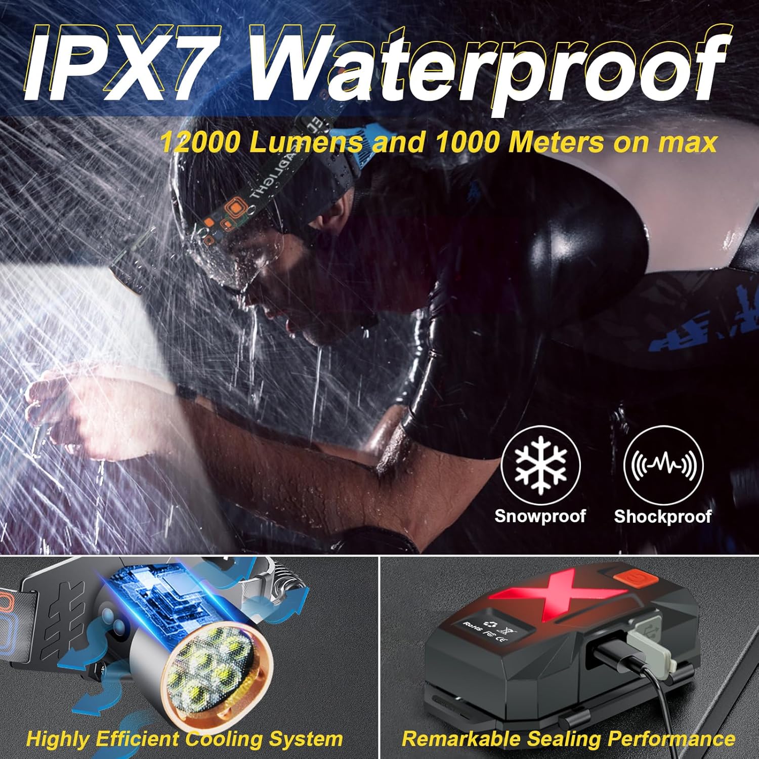 - Super Bright for Night Lighting : Experience ultimate clarity during night activities with our headlamp rechargeable featuring 7 XTE LED beams and a safety taillight. Delivering 12000 lumen light up to 500 meters, this outdoor rechargeable headlight help you see every detail in complete darkness. The battery indicator displays the remaining power, so you always know when to recharge